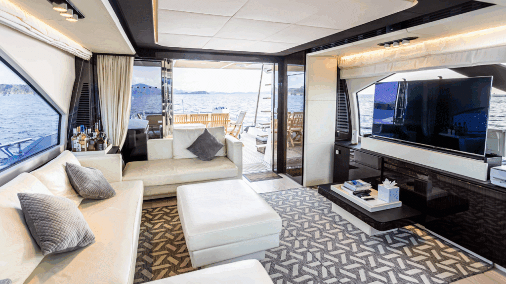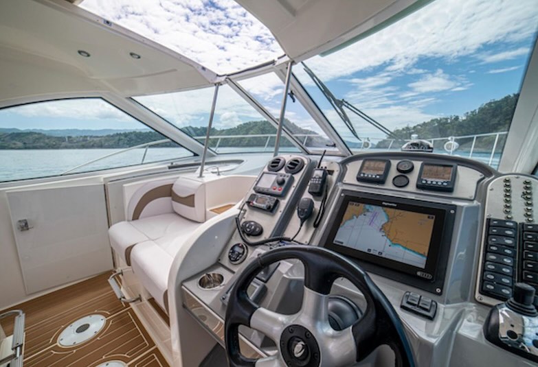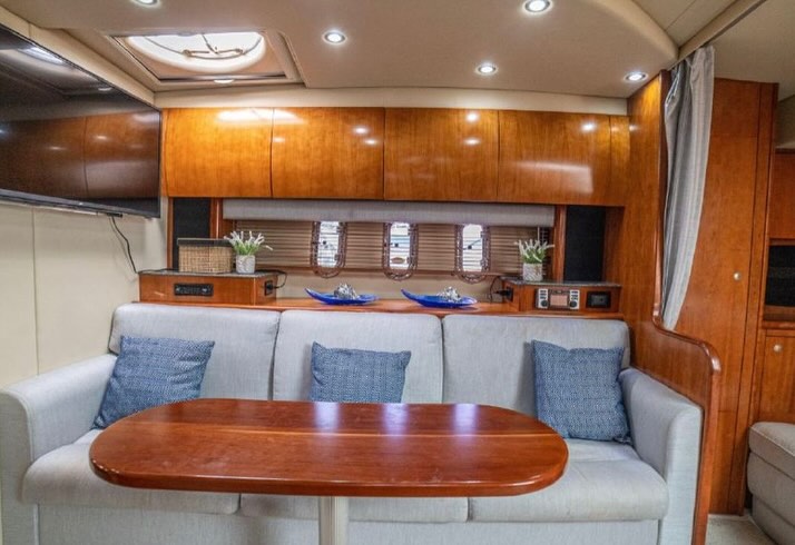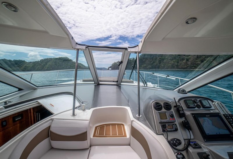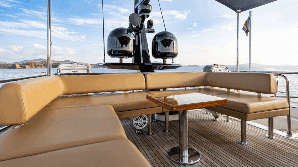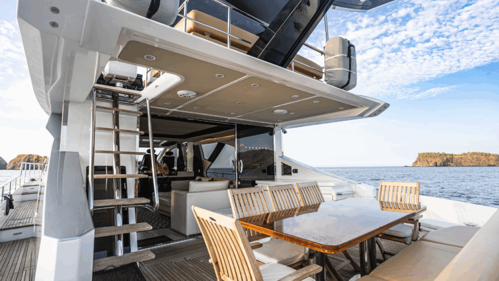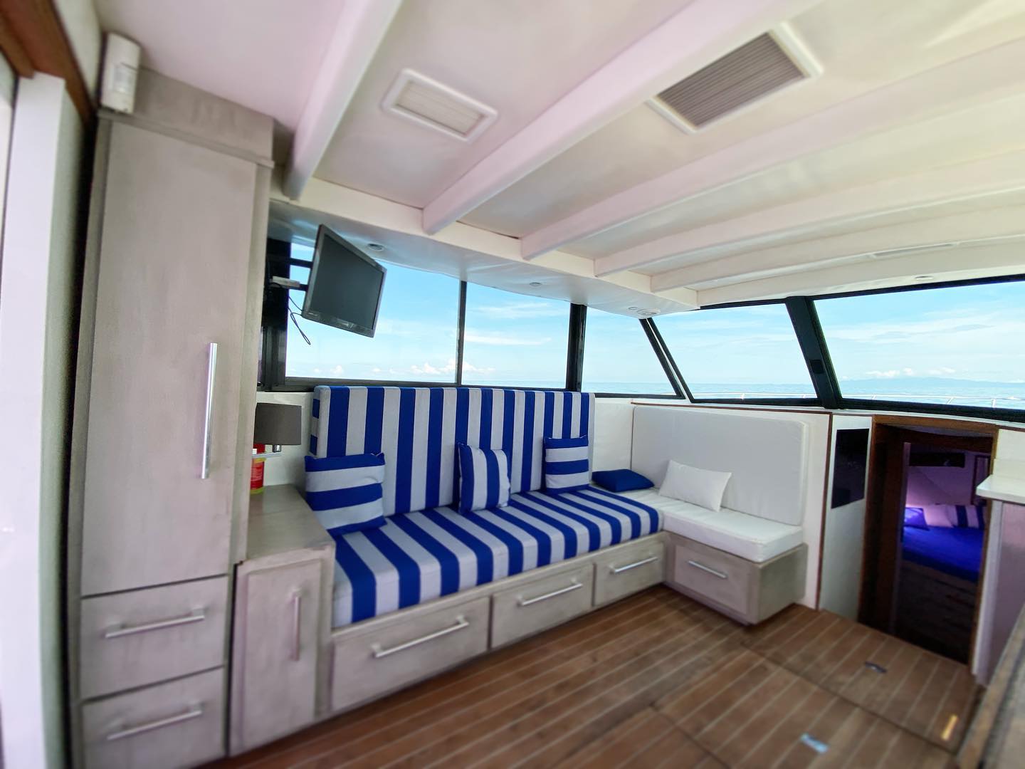 Enter the side gates of the yacht, or enter via the transom/swim-platform. Two sets of stairs will bring one to a cockpit where people can socialize and do sightseeing. The flybridge also shades the cockpit which can comfortably accommodate 10 guests to have an al-fresco meal. A mini fridge and outside wet bar are available to serve drinks.