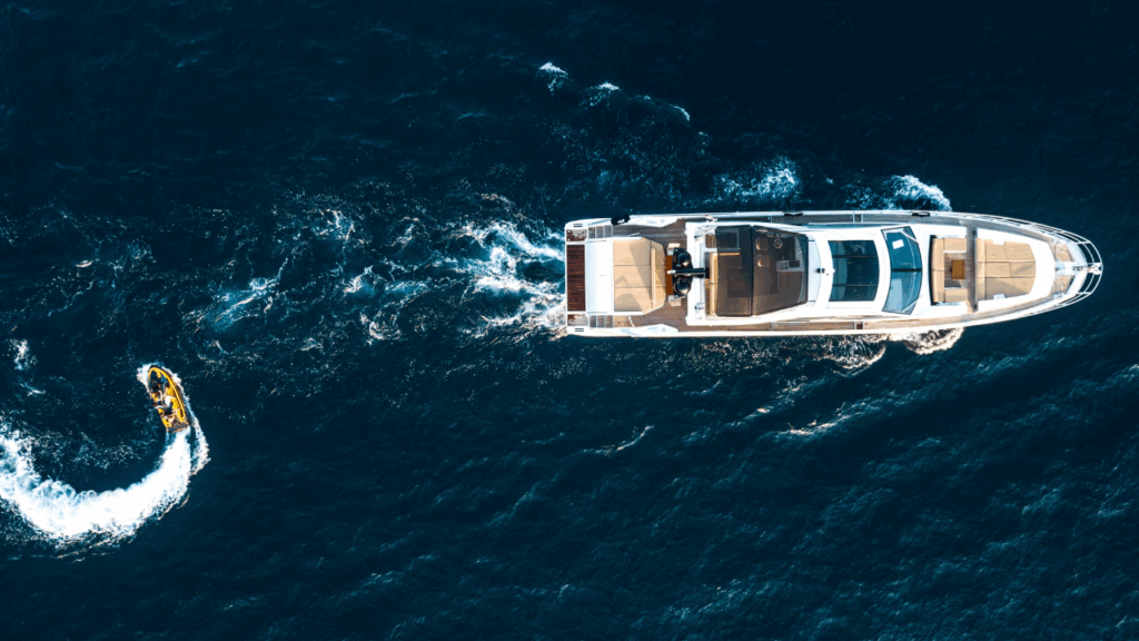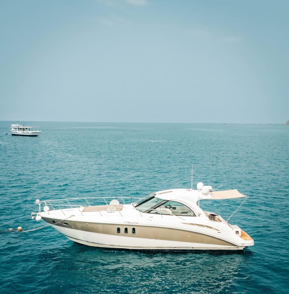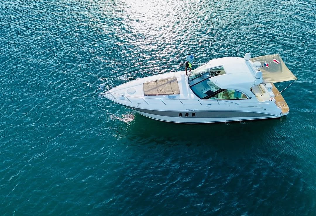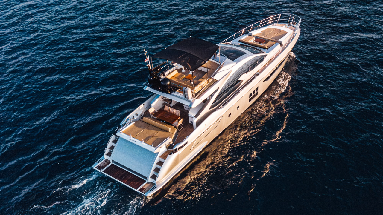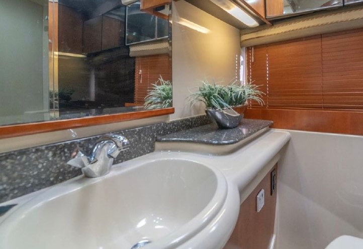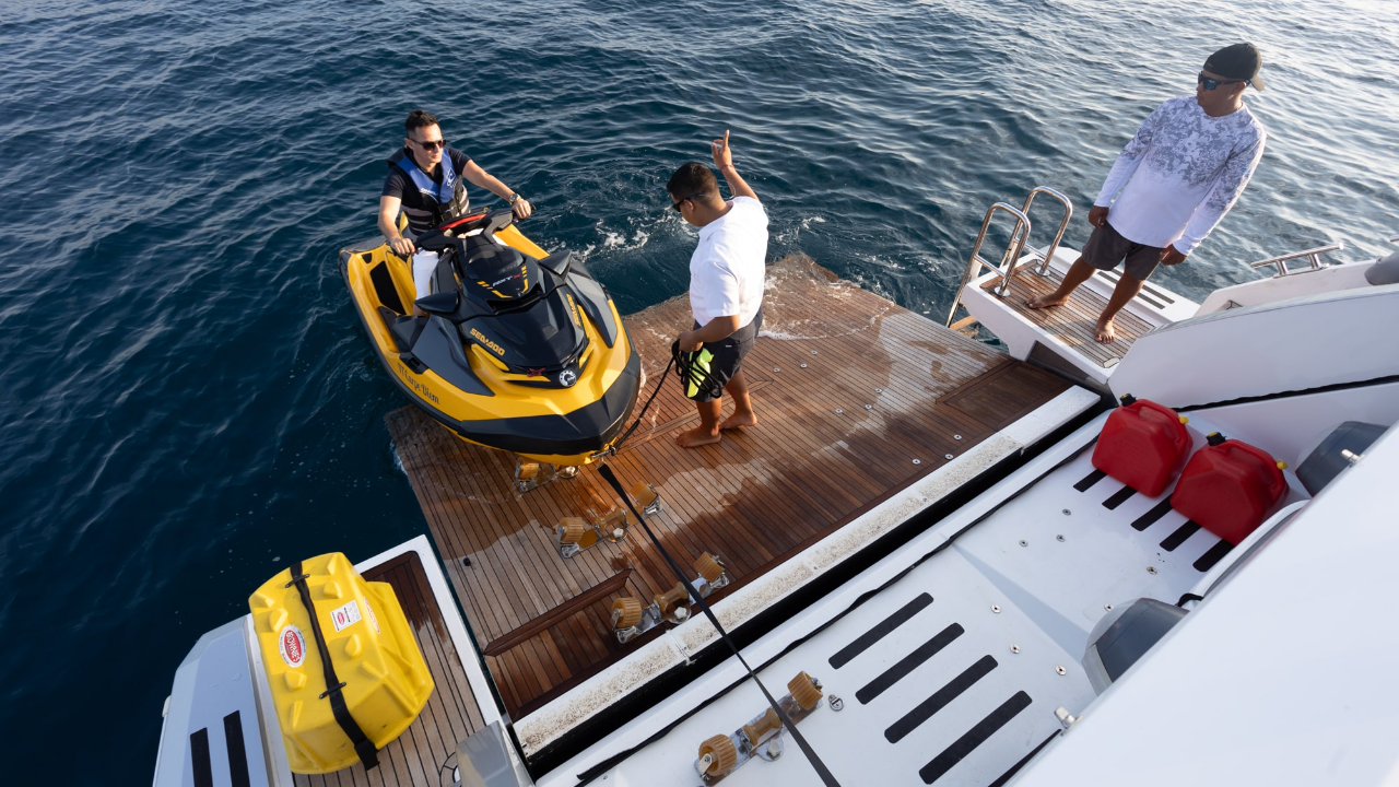 Enter the side gates of the yacht, or enter via the transom/swim-platform. Two sets of stairs will bring one to a cockpit where people can socialize and do sightseeing. The flybridge also shades the cockpit which can comfortably accommodate 10 guests to have an al-fresco meal. A mini fridge and outside wet bar are available to serve drinks.