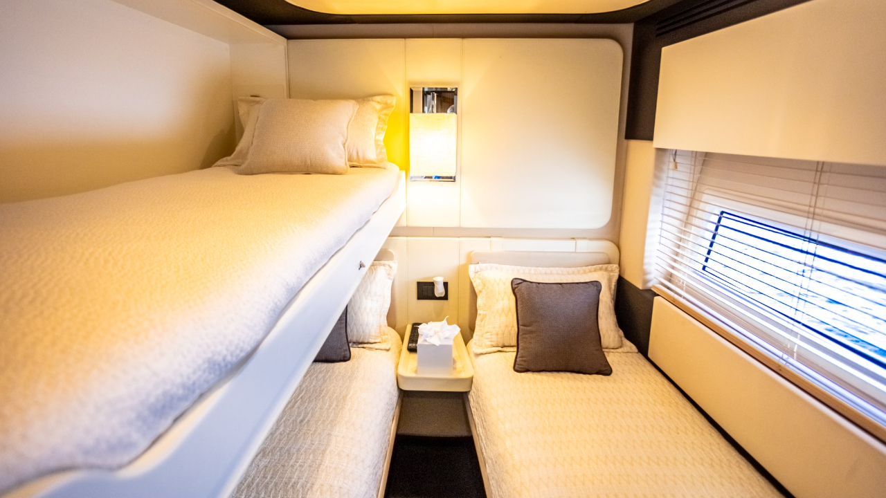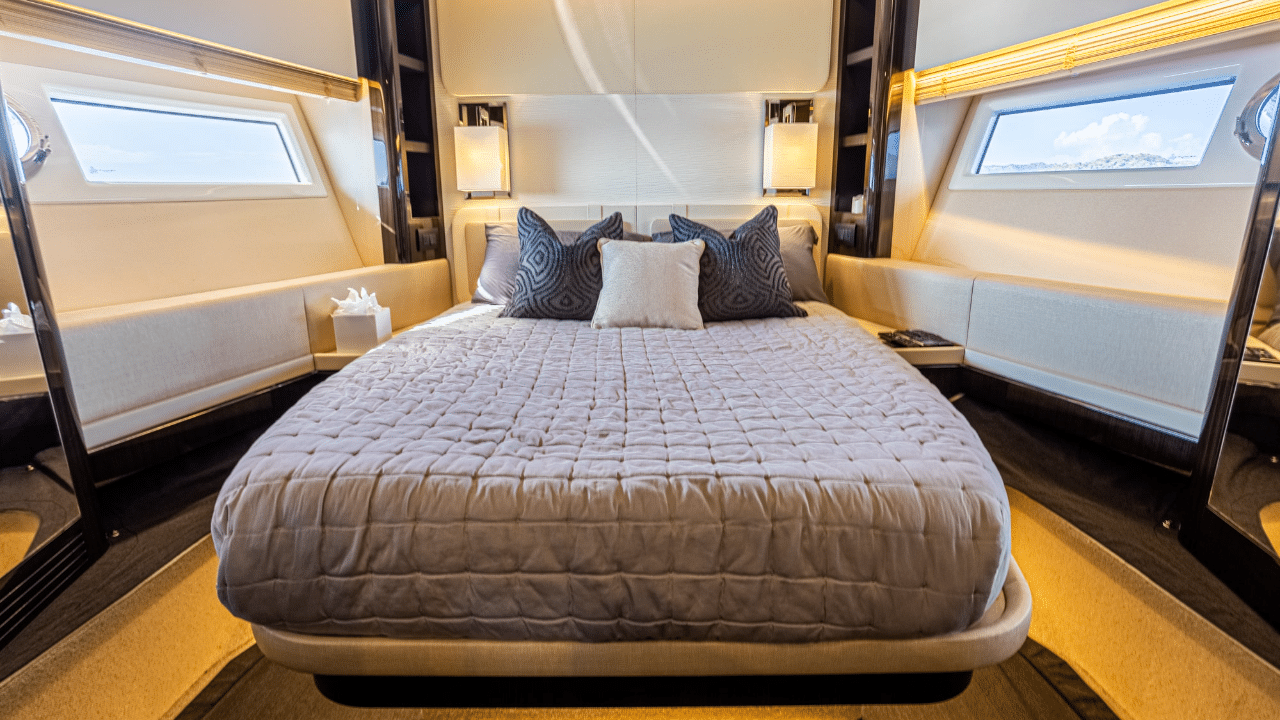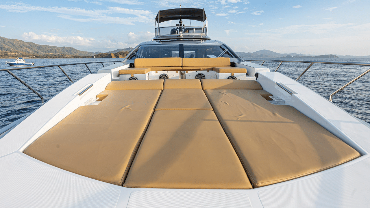 - Bow area with two sun pads and access from walk-around side decks or two wing doors