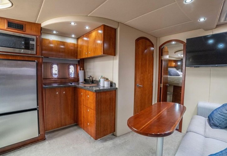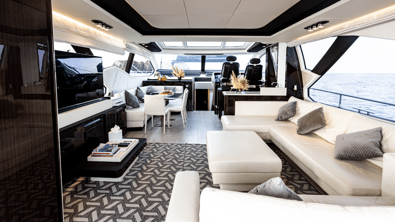 - Full-service bar, dining area with BBQ, elevated dinette, and upper-helm station on sun deck