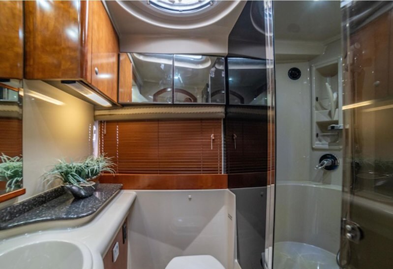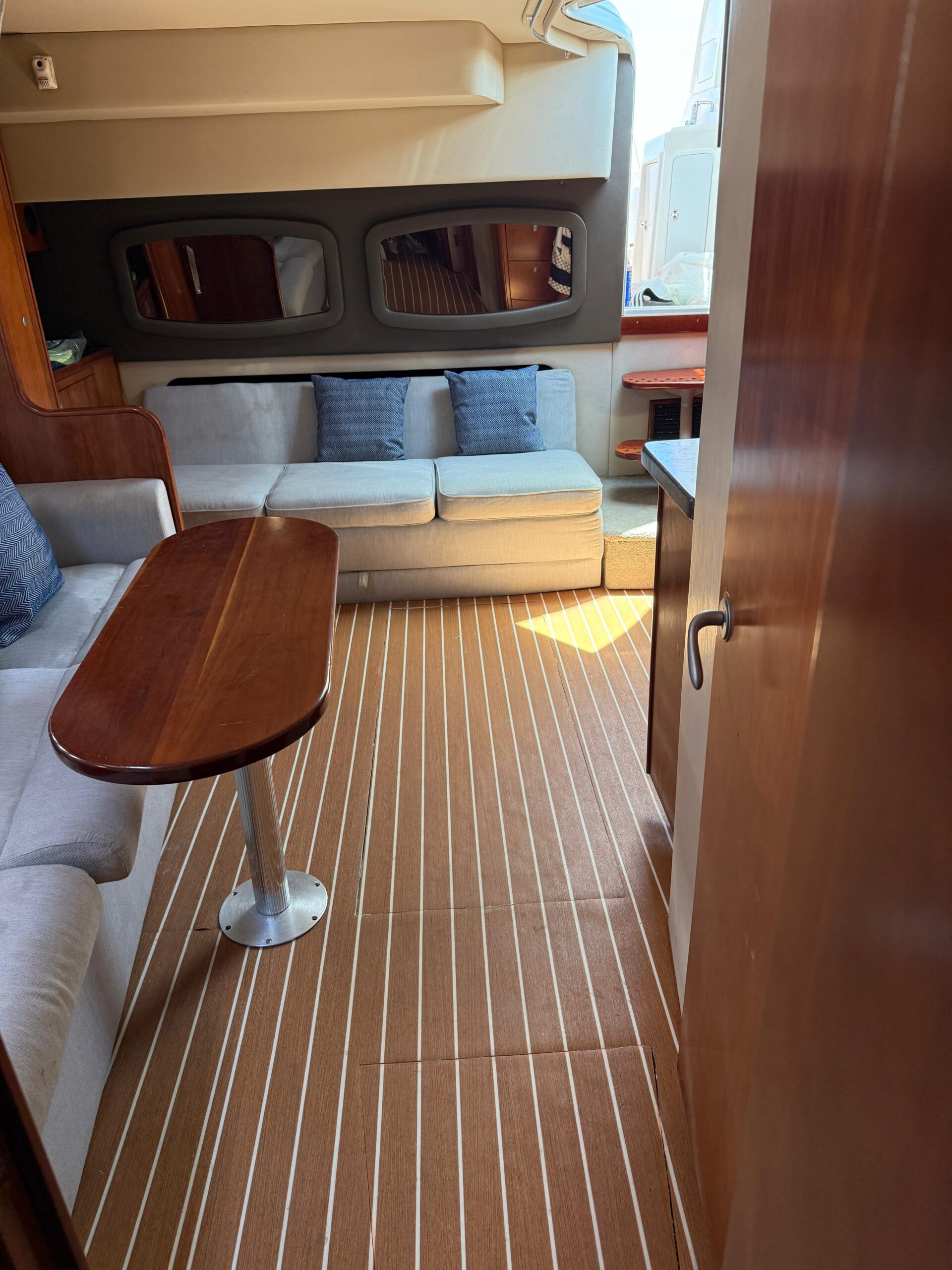 The formal dining area is very forward, and it is 10 seats. On the port side it has a day head and on the starboard side there is a bulkhead that extends to the starboard side pocket door leading to the main foyer. The foyer leads to the wheelhouse, lower deck (guest rooms), theatre room or/and galley immediately in front of the foyer.